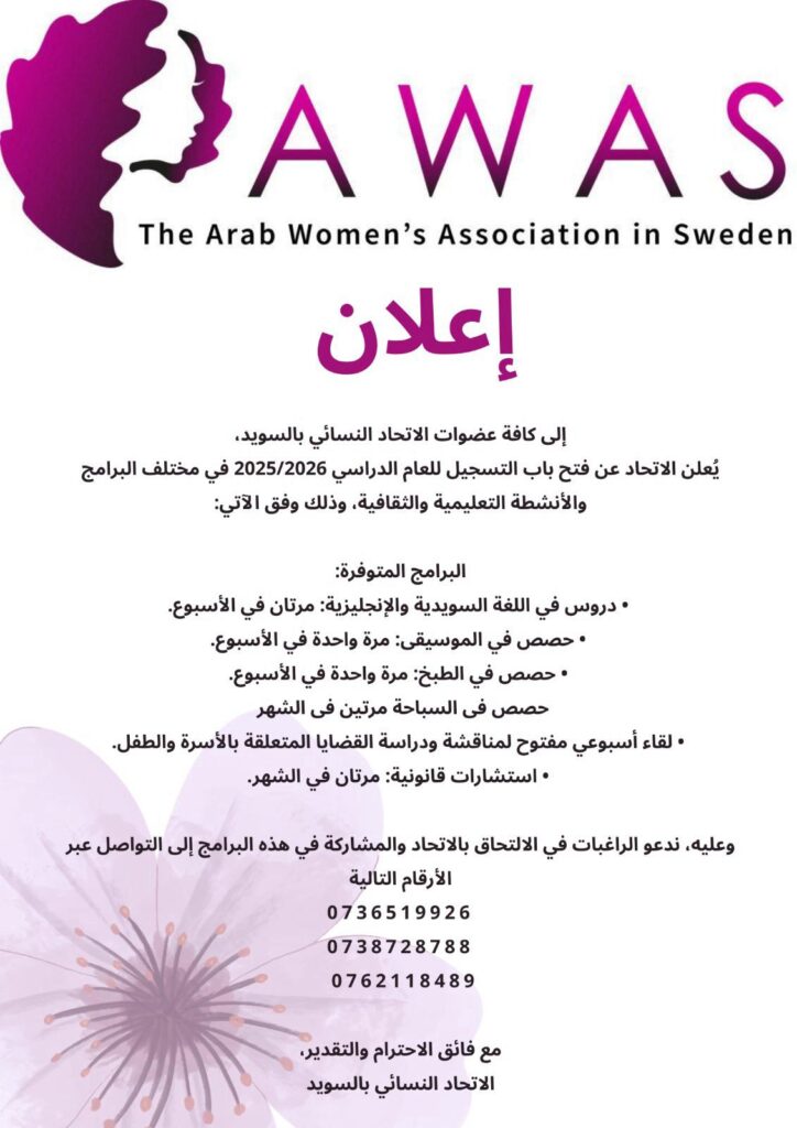 ستوكهولم – أعلن الاتحاد النسائي العربي بالسويد (AWAS) عن فتح باب التسجيل للعام الدراسي 2025/2026، مقدماً مجموعة متنوعة من البرامج والأنشطة التعليمية والثقافية التي تهدف إلى دعم وتمكين المرأة العربية في السويد.